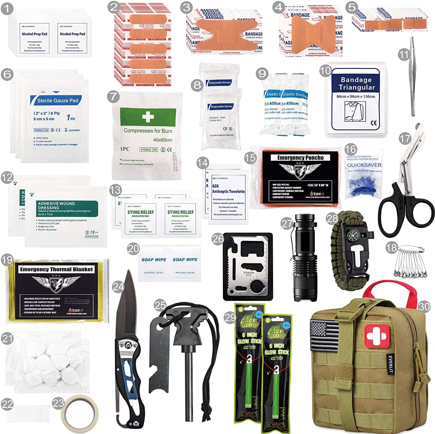 Natatanging na-customize ng mga beterano ng militar ng U.S, na sinubukan ng EX- Army Sergent, na idinisenyo upang maging handa ka nang husto sa isang emergency na sitwasyon. Pinagsasama ng kit ang 241 PCS First Aid Supply na may 9 na makapangyarihang Survival Gear sa isang Must-Have EDC emergency kit.